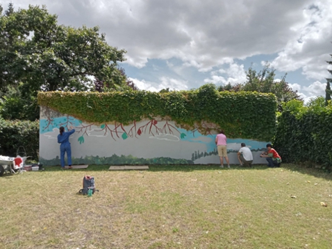 d’une idée, d'un objectif ou un vœu, je conduis la réalisation de fresques en collaboration avec le public concerné : élèves, habitants, employés d'une entreprise...