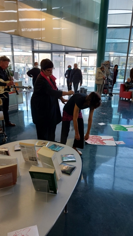 Mon besoin de partager, d’être en lien me pousse à sortir de l’atelier pour peindre en direct, vers le public, pour offrir aux regards des autres mon processus créatif. Je mets l'œil en mode participatif et le confronte à des émotions, c’est une chose de regarder une œuvre, c’en est une autre de participer à sa réalisation. Réaliser une œuvre pour un événement particulier, me sort de ma zone de confort et met en branle ma créativité. J’aime allier mes performances plastiques avec d’autres disciplines comme la musique, la danse, lecture… C’est une manière pour moi de faire lien avec d’autres arts, d'autres artistes. Ou à l'occasion de la brigade poétique organisée par l'ASLA, "il y a un arbre dans ma tête", à la médiathèque d'Orléans pour la venue de Samira Négrouch en 2022.
